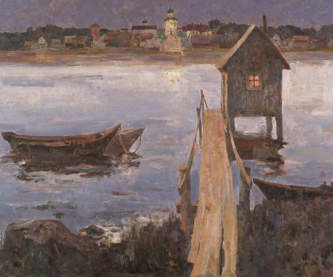 在这样一幅看似极其朴素的夜景里,达尼洛维奇也暗藏着许多花样。远景的建筑群被处理成几乎严格的中轴对称,宽阔的天空与倒影连在一起,这画面最上方稳固的平行构图和平铺的水面,奠定了小河平稳广阔的基调。为配合横平竖直的稳定感,在画面的下方,小桥就采取了几乎垂直伸入的角度(为了使得这根竖直的木头向画面纵深处走去,他就以近处的小船和远处水面上的小房子的阴影,来点明水面的高度)。为了柔化这强硬的介入,画家又安排了一大批曲线的呼应,让左侧小船的弧线与右侧屋顶的弧线遥遥相连,近景的河岸轮廓也与小桥的两侧扶手组成了一左一右两道长长的弧线,令平行构图在局部上几乎成了富于动感的对角线构图。