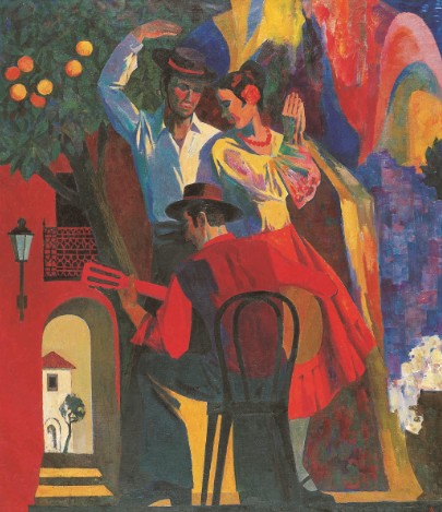 画中的三个人一起向左侧倾斜着,为强调他们的倾斜度,身旁的树也一起向左歪去。树上的果子嵌在一片深色背景中,其亮色也与两位舞者的上衣遥相呼应,成了舞者向着画布对角线上的延伸。而舞者的姿态向着右下方的延伸,则靠另一条暗黄的色带来完成。如此厚重的倾斜在画面的下部获得了一连串的支撑,从椅子的左腿,到舞者和演奏者的腿,再到那最明确有力的拱门