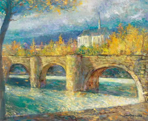 夫妻俩致力于当代美术创作,来国强介绍说:“圣经的开端有这样的记载,上帝说要有光世界便有了光,于是接下来就有了世间的万物。这是我在欧洲画教堂时常常想到的经典里的情节,也是我完成这一系列的写生作品最有感触的地方。油画是表现色彩与光交织出来的世界,当然也能从色彩和光线中让我一次次去触碰到神性。我没有见过上帝,便猜想上帝应该是一种存在,一种能唤起人性中最崇高、最美好的超验的一种存在,理所应当也是无处不在的,绘画只不过是用油彩去扑捉这种存在。从老教堂的古老而斑驳的墙面到小树林婆娑嫩叶间流淌的光线,从夕阳映红的古堡到未来海面上升腾起的水雾……。我把画面看成是人与神相遇时让你感动的那一瞬间的媒介,犹如西斯廷教堂天顶壁画上所描绘的亚当与上帝的手指相触时的那种感动。”
