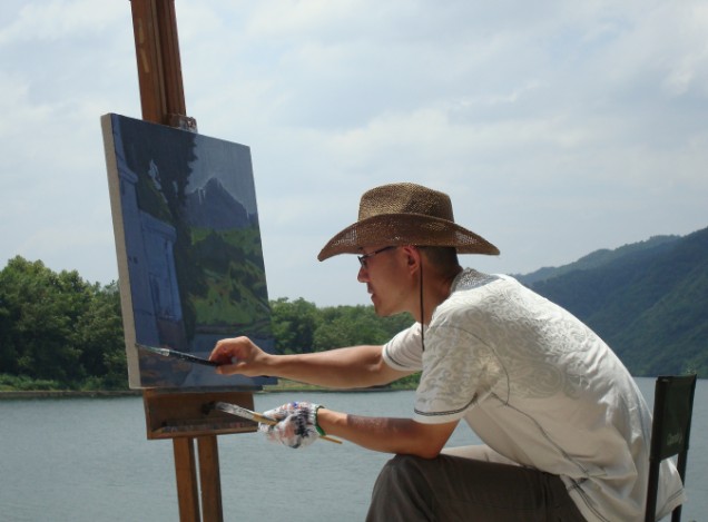 在国外任教、留学十几年,林涛有着丰富的艺术经历,对油画艺术卓有见解。他的作品个性十足,既有长期古典绘画的传统功力,又有因为阅历的积淀而对绘画本身在当代艺术实践中所扮演角色的反思,是一位“思考”与“创作”并重的艺术家。此次展出的是林博士近年来的风景画作,我们能看到随着时间的推进,艺术家在形式语言上的不懈探索,不断地融合、扬弃,开辟出专属自己的艺术道路。林博士最为重视作品中的人文精神,他认为中国的书法是一种最具承载力的艺术形式,对书法来说最重要的是书写的状态,并非描摹或者打磨,而是一种回归山林的自在诗意。这也是林博士对于油画这一语言进行探索的新方向。