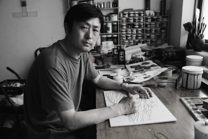 1996年的秋天,我有幸再次跨进中国美术学院的大门,师从邬继德和朱维明先生。在学院北面有一幢叫“紫竹斋”的青砖平房,是韩黎坤和邬继德两位先生为版画系留下的中国传统水印版画实验室。当时实验室里有两位老技师,王刚和陈品超先生。只见方正印台上夹着厚厚的一叠红星净皮,老技师叼着烟,在砚台里悠悠地磨着墨,将墨磨得浓浓的,用水调在碗里,咬着老式喷壶的铜嘴,对着印台上的宣纸“噗”地喷上一口水,一叠纸喷完,压上玻璃板。待抽完烟,喝口浓茶,捏起一张宣纸,拉过来,覆在刷好墨色的版上,用靶子隔着白板纸轻轻地一刷,摊开纸,一抹文雅透明的淡墨在宣纸上洇化开……