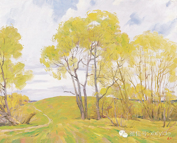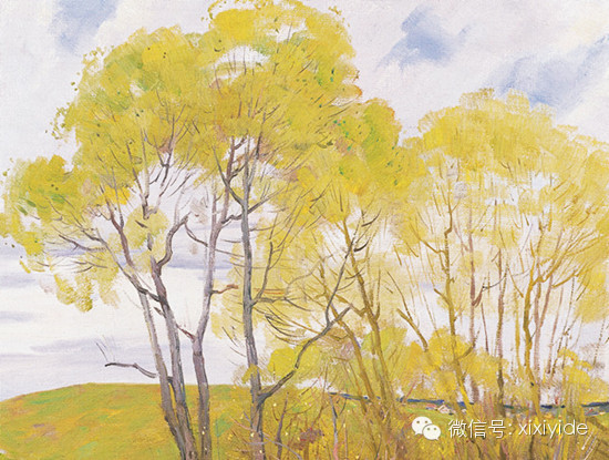 事实上细节的描画都被狡黠地省略去了,树丛的枝干之间只留下了没有明确笔触、甚至没有明确树叶形状的细微朦胧的涂抹(只在中间树冠里最后点缀一些深绿色的叶尖,以丰富主角的层次)。所有虚化的处理都是为了衬托枝干的实,使那些断续而活泼的弧线看起来更有力,让观众无论离得多远,都感到枝杈分明,仿佛近在眼前。在这些仿佛偷懒般的简化的手法里,毫无敷衍、欠推敲、程式化的迹象,相反,枝叶疏密交错,明明灭灭,仿佛有空气在枝干间流动。背景只有清亮的水天一色,只在高空云层才略略散开,透出一点天蓝。通过这彻底简化了的深远辽阔的背景,草地上这几棵秀气的小树就具备了一种高高伫立的神气,她们清高骄傲,却又温和可亲。