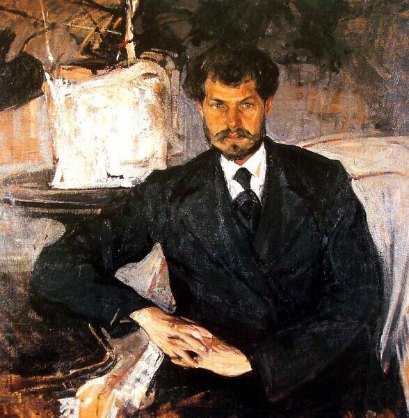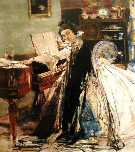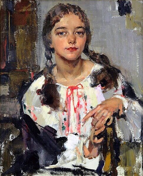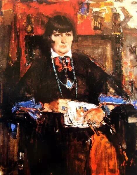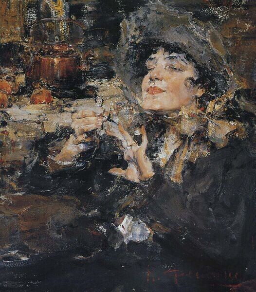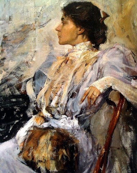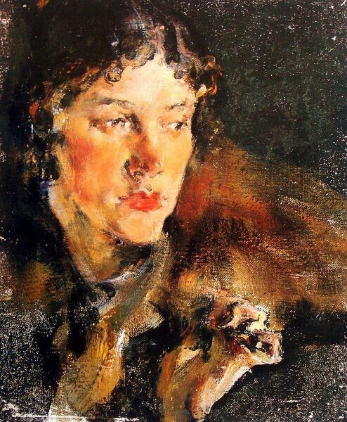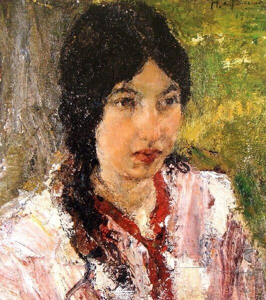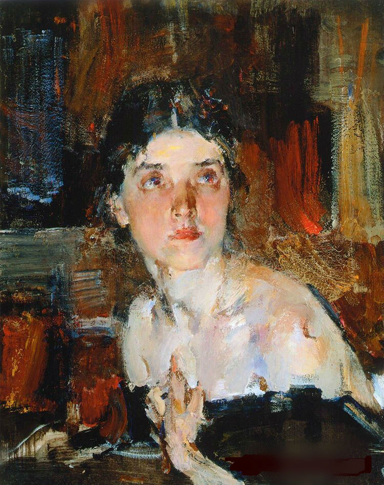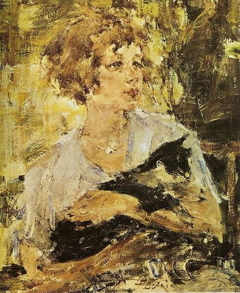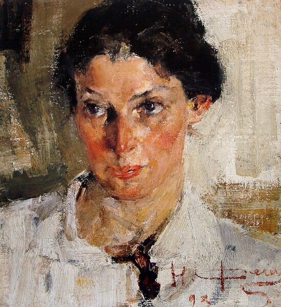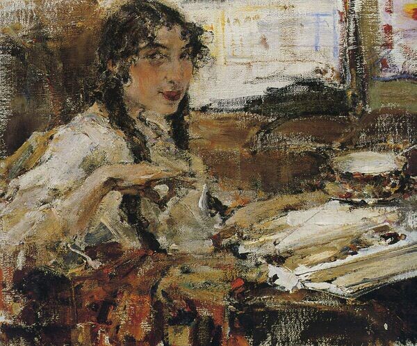 在学院毕业前后的几年里,费钦创作了——系列出色的肖像画,使他成名的第—件肖像画作品《紫衣夫人》(有名《无名女士肖像》)1908年在慕尼黑国际博览会上获得了小金奖。1914年费钦创作了《瓦丽雅·阿多拉斯特卡娅肖像》,洁净珍珠般的色彩,完美的现实主义形式都表现在这幅作品里。作品画得柔和、精练、和谐,就其艺术性而言完全可以和列宾的《蜻蜒》、谢洛夫的《少女和桃子》相媲美。费钦画画不喜欢用单一的艺术表现手法,那散发着光彩的绘画,带有激情短促的笔触和多层次粗糙的表面是他长期艺术积累的结晶。一旦需要他就采用透明颜色调整色调的办法,他用一层薄薄的颜色罩在另一层上,这个技法并不比17世纪西方人逊色。有时他用宽阔的笔触,利用白画布的亮光和特点画画。他善于探索白色和黑色的细微差别,他喜欢使用“调色板加画刀”的技术。