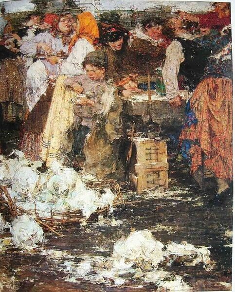 尼古拉·伊万诺维奇·费钦,1879年出生在俄罗斯伏尔加河畔的喀山。父亲是木雕工和镀金匠,儿童时代的费钦就跟着父亲的木雕和镀金包工队一起出发到附近和遥远的农村闯荡,替教堂装修圣像和壁画,完成那里的雕刻工作。他们都是凭良心和手艺吃饭的善良艺人。他们走遍了伏尔加河沿岸的市镇和农庄,他深深地热爱着那里的人民,那里的湖泊和森林。父亲是费钦的启蒙老师,他赞赏儿子的绘画和木雕手艺,一心想让儿子跟圣像画师学艺,当个好艺人。