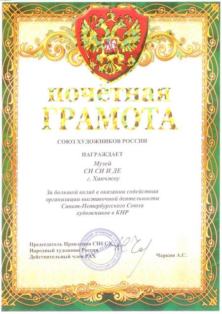 鉴于西溪艺得美术馆在中俄艺术交流上的贡献,俄罗斯列宾美术学院院长、圣彼得堡美术家协会主席、俄罗斯人民艺术家A.C.查尔金先生特签发表彰证书,授予西溪艺得美术馆,以表达对西溪艺得美术馆卓有成效的艺术交流和推广工作的认可。