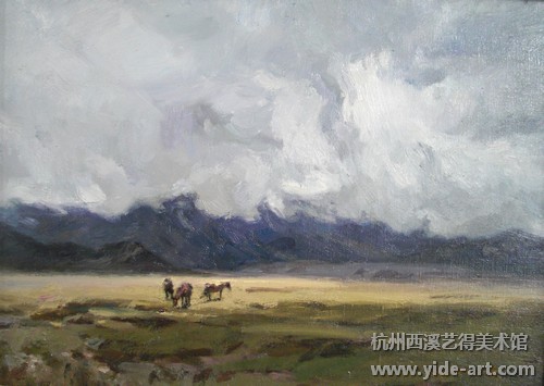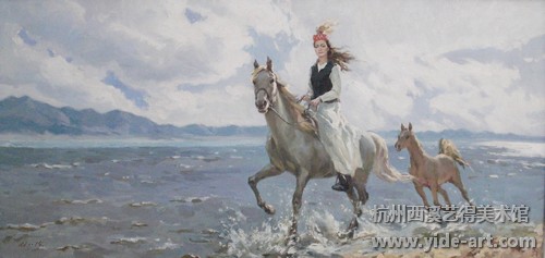 2000年,艺术家在赛里木湖边看到几个男孩骑马,后来创作了这个作品,艺术家把骑马的男孩子换成了一位成年美丽的女子,画面上女子表情沉静与动感的奔马形成对比,表达艺术家心目中外貌秀美内心含蓄宁静的女性形象。该作品色彩优雅含蓄,是艺术家最具代表性的风景人物作品之一。