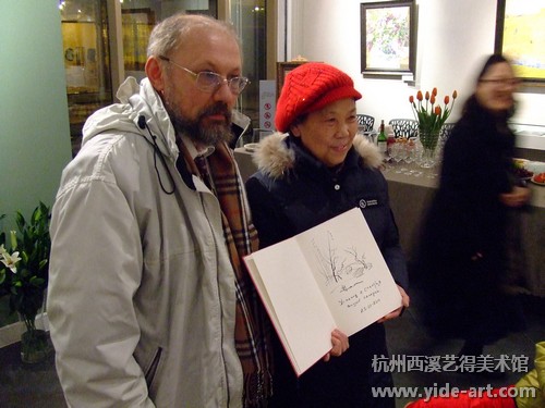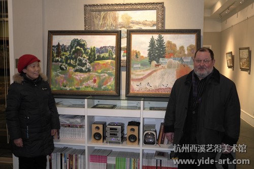 西溪艺得美术馆执行董事李宝爱女士和列宾谢尔盖教授在他的作品前留影