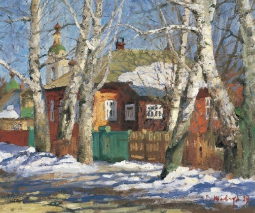 这幅画简洁、紧凑、统一,仿佛一气呵成。谢夫楚科按捺住了他对笔尖细微颤动的热爱,代之以对画面效果非常确信时才有的那种粗犷而又轻松的笔法。在画面的上部,围绕树枝颤动的浅色调,是由最后加上的浅蓝色天空的空隙所“留”出的负形,屋顶上的花纹也是如此,这种仿佛闪动的斑驳统一了整幅画的上半部分,使得粗壮的树干看起来极富活力,也使得简单的民居看起来丰富厚重。由于斑驳闪动无处不在,画面的构图并不是由清晰的对象(比如大树的线条或者屋子的轮廓)构成,而是由对比明确的几个色彩块面(蓝天、绿色屋顶、红墙)作为背景色来切割开的。这种区分使得整个上部虽然都罩在斑驳的树影里,还是看起来层次清楚,避免了繁复之弊。
