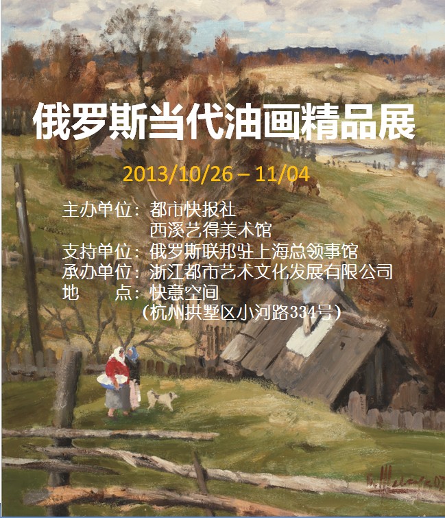 由都市快报社和杭州西溪艺得美术馆共同主办的“俄罗斯当代油画精品展”将于10月26日至11月4日举办,展览将展出十多位俄罗斯当代著名艺术家的100件油画精品,包括俄罗斯国宝级艺术家彼得•吉莫非叶维奇•珐明、瓦西里•瓦西里叶维奇•萨卡洛夫、瓦•库拉科夫等的近三十件精品。