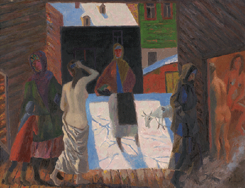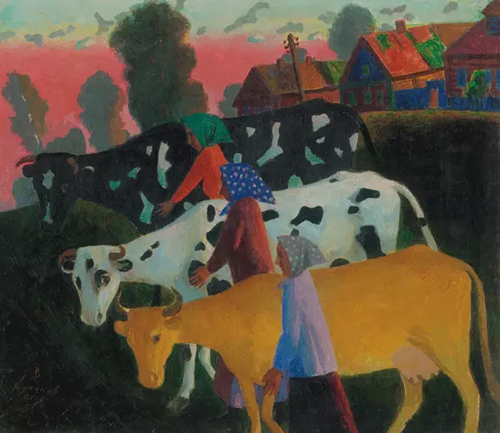 库拉科夫追求线和色彩自身的表现力以及画面的装饰性,平面化的人物和多点透视的处理,使画面渗透着强烈情感的主观世界。在表现手法上,吸取后印象派几何块面的手法,体现一种现代感的艺术语言。画面采用稳定性的色彩内在结构的表现,达到他追求的色彩与形体的结合。他的这种重在艺术形式的追求的创作倾向,对俄罗斯西方现代主义美术流派提供了可资借鉴的范式。