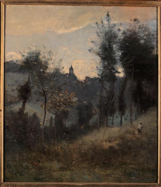 柯罗 《芒特,透过树丛看到的教堂和城市》 1789-1914 布面油画 52.1X32.6CM 现藏于REIMS美术馆